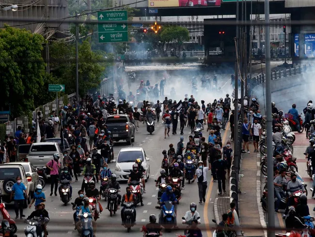 Sute de manifestanţi au defilat pe străzile capitalei Bangkok în motociclete sau maşini, iar spre seară au izbucnit ciocniri. Unii dintre protestatari au aruncat petarde şi artificii în forţele de ordine, care au răspuns cu gloanţe de cauciuc, tunuri de apă şi gaze lacrimogene. O gheretă a poliţiei rutiere a fost incendiată, între altele.