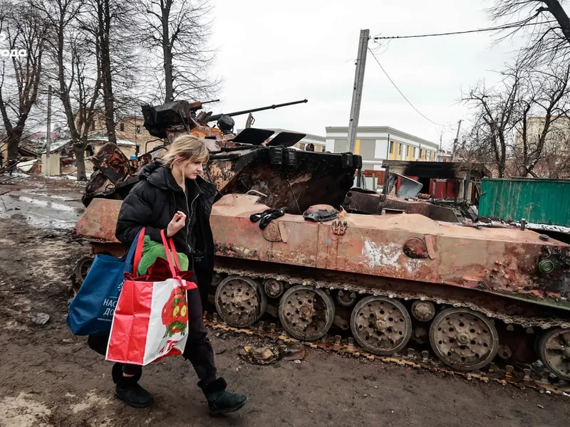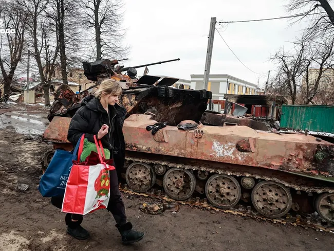 Bucăţi din epava unui avion SU 25 SM doborât pe 2 martie pe raza satului Vîşegrad, despre care se crede că a fost folosit pentru bombardarea oraşului Irpin, dar şi mai multe transportoare blindate capturate la Hostomel au fost amplasate pe strada Lavrska, în faţa Muzeului Naţional Militar - Istoric al Ucrainei.