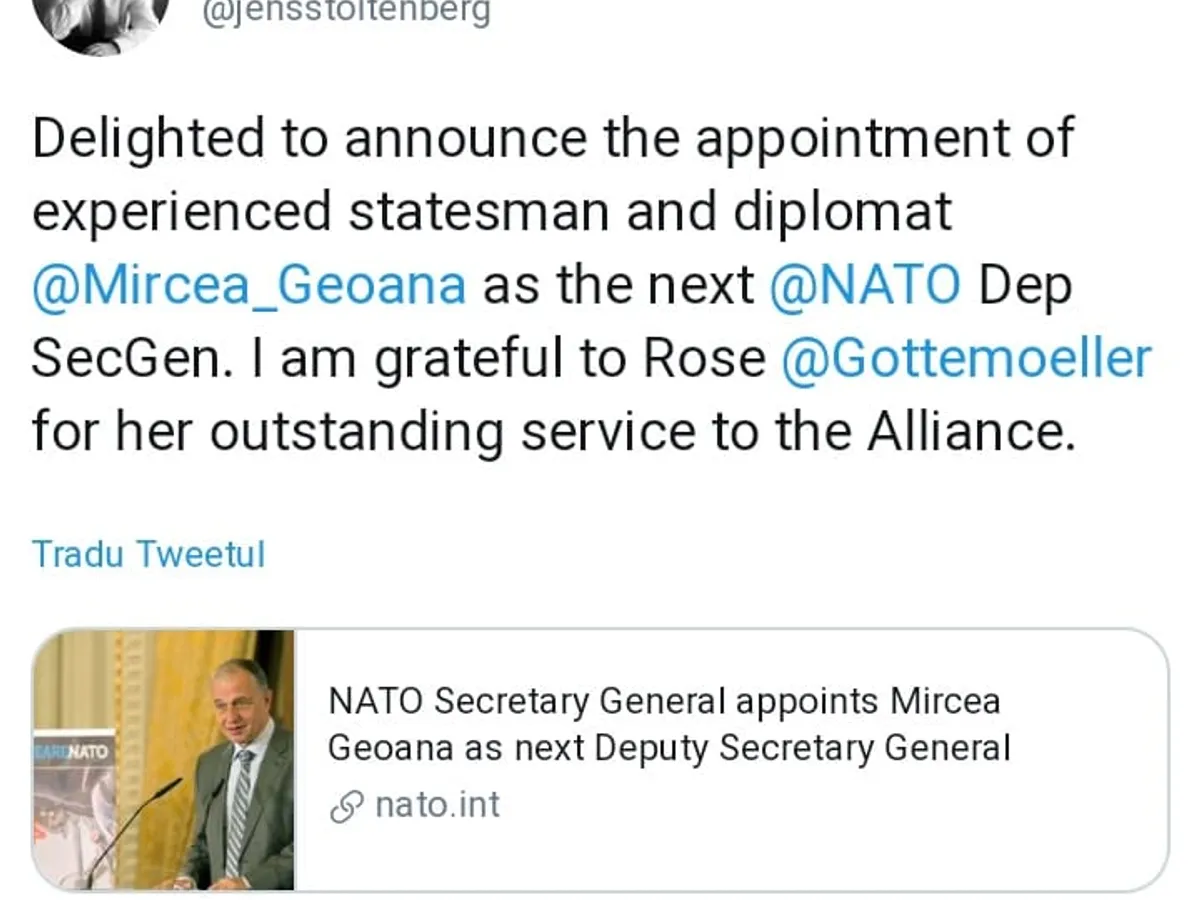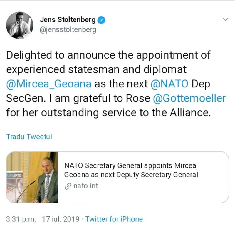 „Sunt bucuros să anunţ numirea lui Mircea Geoană în funcţia de adjunct al secretarului general NATO. Este un promotor puternic al relaţiilor transatlantice şi va aduce experienţa îndelungată de politician şi diplomat. Va fi primul român care deţine această poziţie înaltă", a declarat Jens Stoltenberg, conform unui comunicat postat pe site-ul NATO.