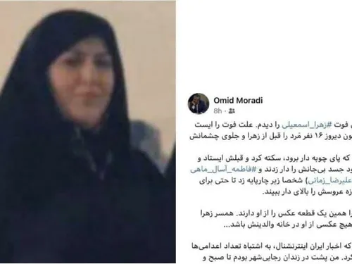 "Certificatul de deces menționează stopul cardiac drept cauza morții pentru că 16 bărbați au fost spânzurați în fața ochilor ei. Inima lui Zahra s-a oprit și ea a murit înainte să fie urcată pe eșafod", ar fi scris avocatul Moradi.
