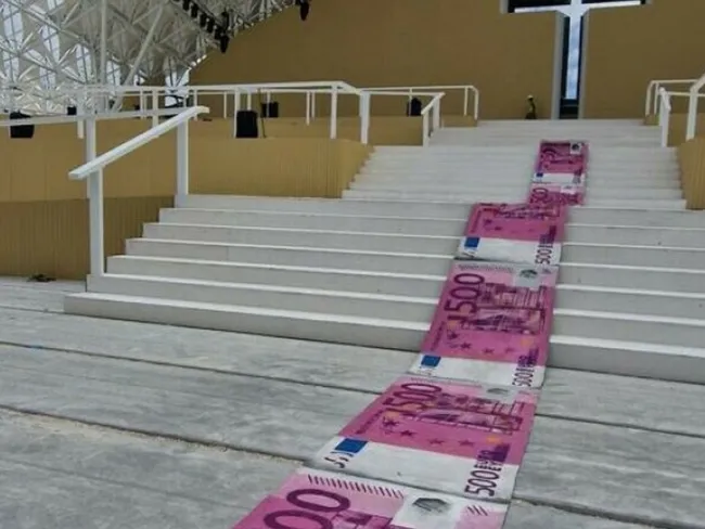 Un artist de stradă portughez a întins un covor uriaș de bancnote supradimensionate de 500 de euro în locul din Lisabona unde Papa Francisc va celebra o slujbă săptămâna viitoare, ca protest pentru sumele alocate de stat acestui eveniment.