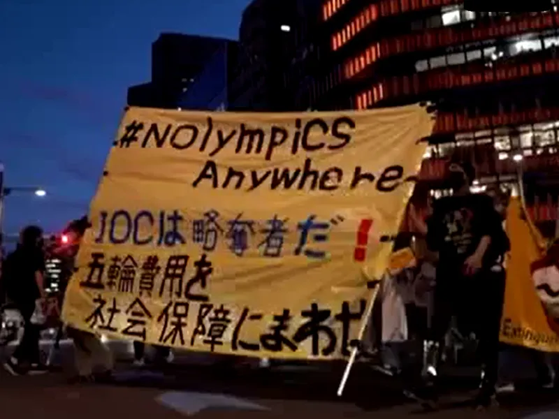 Protestatarii purtau pancarte pe care scria Nu Olimpiadei și Opriți Genocidul. Japonezii sunt speriați că, în pofida tuturor măsurilor sanitare anti-COVID, organizarea competițiilor cu sportivi din toate colțurile lumii va duce la o explozie de cazuri.