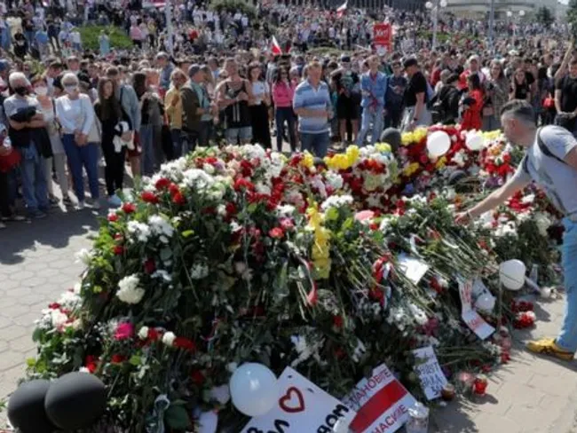 Oamenii s-au îndreptat spre staţia de metrou Puşkinskaia, la vest de centrul oraşului Minsk, pentru a aduce un omagiu unui manifestant mort în apropiere în timpul unei demonstraţii ce a avut loc luni.
