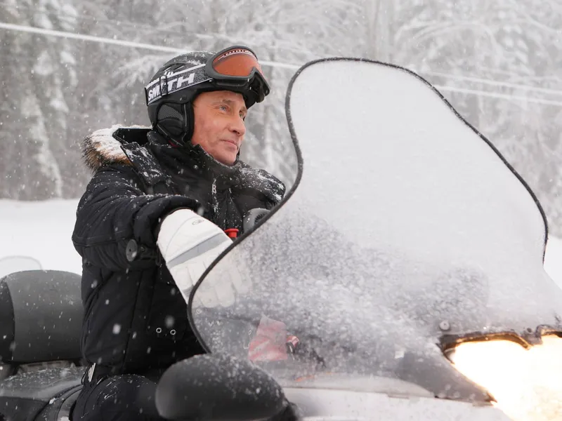În ianuarie, Putin este prezentat pe un snowmobil. Citatul lunii respective: „Granița Rusiei nu se termină niciodată”.