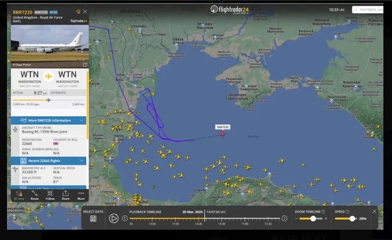 Avionul spion britanic de 330 de milioane de dolari, plin cu echipamente de detectare și interceptare radio de ultimă generație, a zburat până la un punct la aproximativ 130 km de uscat, potrivit datelor revizuite de Kyiv Post de pe site-ul suedez FlightRadar24 și de platformele de urmărire a traficului aerian ABSExchange.