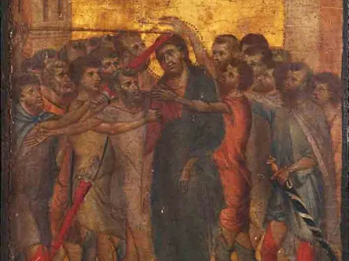 Tabloul este intitulat Hristos batjocorit (Christ Mocked) și îi aparține maestrului florentin pre-renascentist Cimabue.