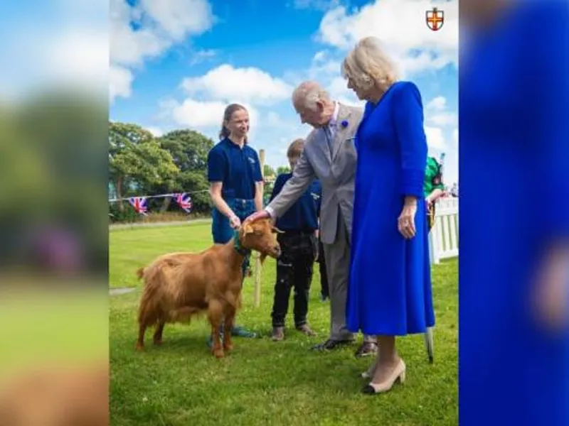 Pentru a marca prima sa vizită în Guernsey ca monarh, Tamsin, o capră Golden Guernsey de opt ani, a fost prezentată într-o ceremonie specială regelui Charles și reginei Camilla.