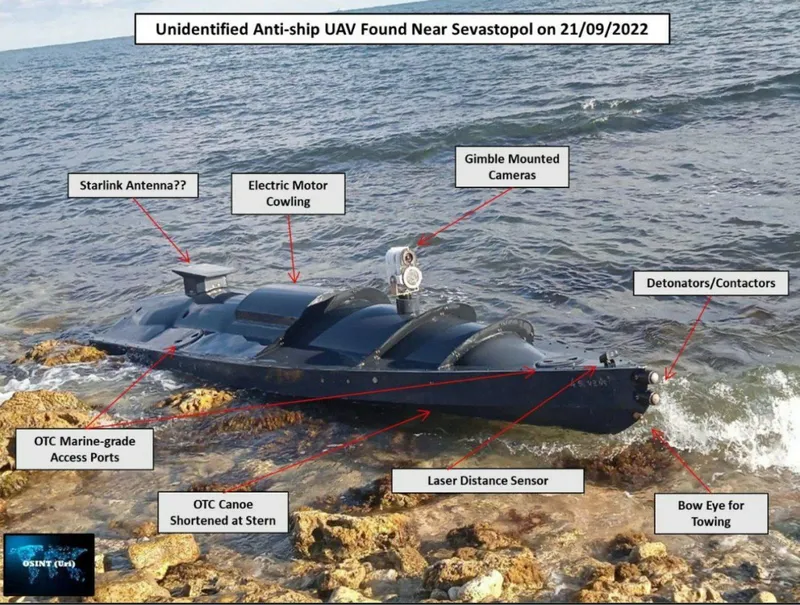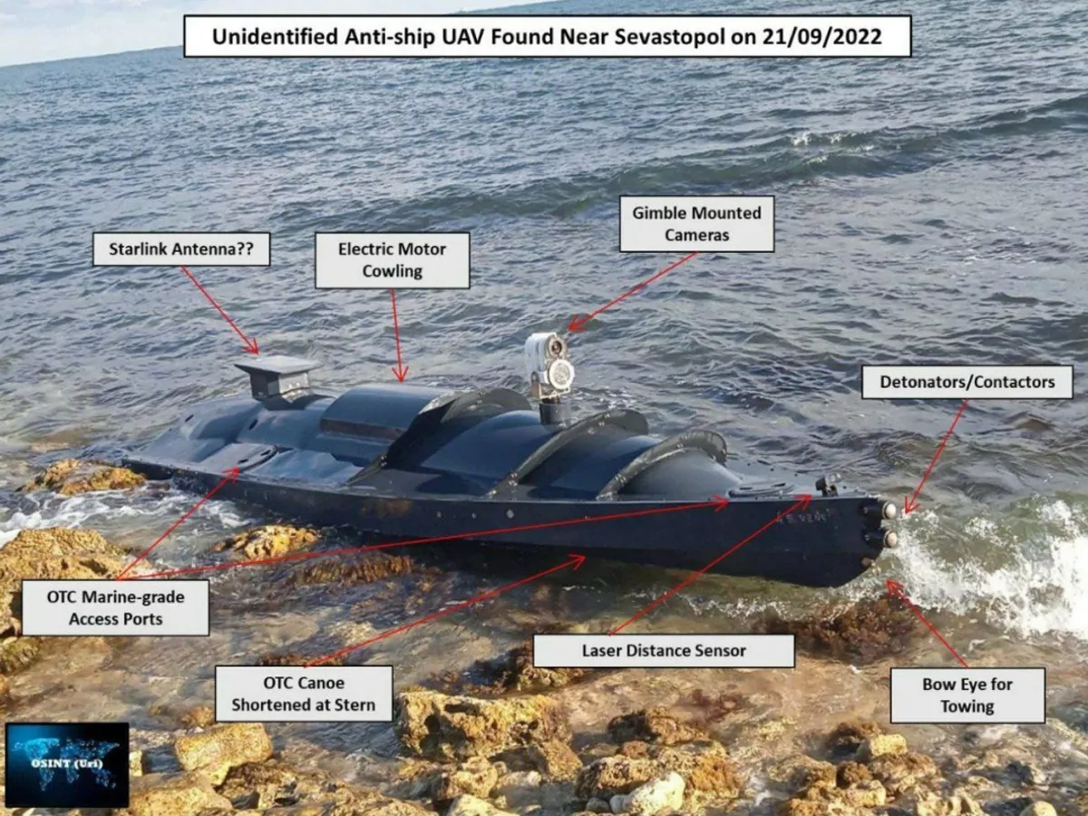 UAV-ul marin este echipat cu un motor mic, senzori și camere, iar forma sa curbată cu întărire exterioară indică prezența unui focos. Raportul privind detonarea ulterioară a dronei susține ipoteza că aceasta transporta explozibili. Este probabil destinată pentru a lovi navele inamice.