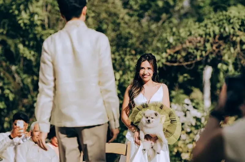 Joelle Yuvienco știa că nu vrea să ducă flori pentru nunta ei, dar când și-a văzut cățelul Sago uitându-se în timp ce făcea fotografii în dimineața nunții ei, a luat o decizie în ultima secundă de a duce câinele pe culoar.