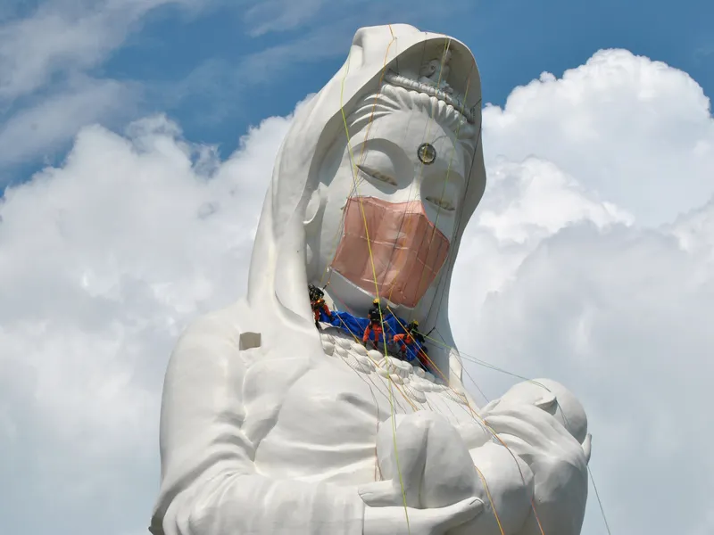 O echipă de muncitori a escaladat marţi o statuie imensă a unei zeiţe budiste din Japonia pentru a instala o mască facială confecţionată special, demers menit să fie o rugăciune pentru finalul pandemiei de coronavirus, informează Reuters.