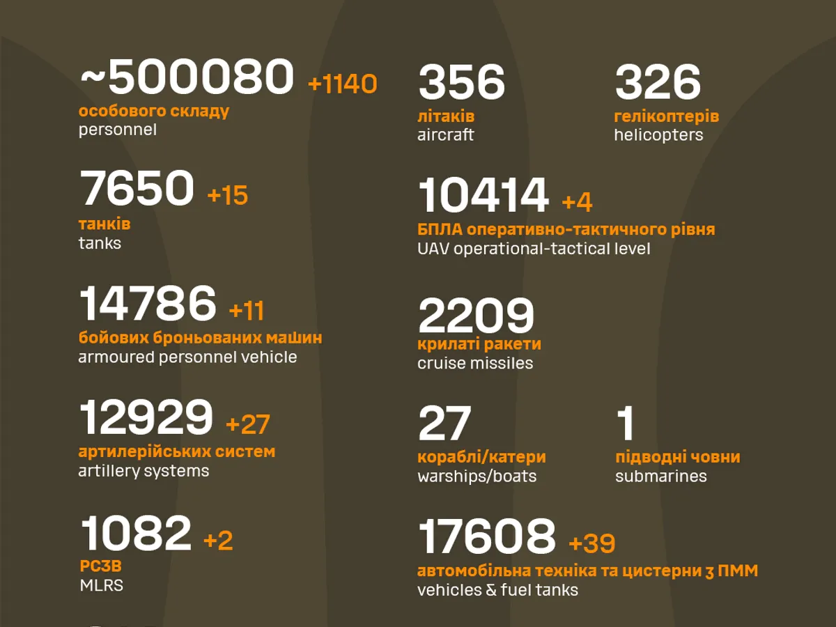 De asemenea, apărătorii ucraineni au distrus 7.650 de tancuri inamice (+15 în ultima zi), 14.786 de vehicule blindate de luptă (+11), 12.929 de sisteme de artilerie (+27), 1.082 de sisteme de rachete cu lansatoare multiple (+2), 814 sisteme de apărare aeriană (+1), 356 de avioane, 326 de elicoptere, 10.414 vehicule aeriene fără pilot (+4), 2.209 rachete de croazieră, 27 de nave de război/cutreiere, 1 submarin, 17.608 autovehicule (+39) și 2.104 unități de echipament special (+3).
