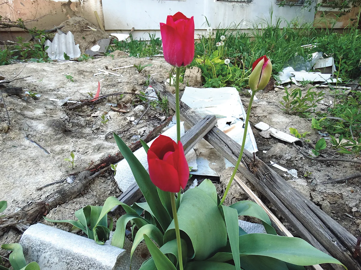 Efectele exploziei asupra clădirilor se văd însă, balcoanele fiind contorsionate, și toate ferestrele sparte și acoperite acum cu placaje de lemn. În mijlocul peisajului dezolant am remarcat un lucru impresionant: chiar lângă un fragment de metal din racheta rusească și printre resturile produse de explozie, au crescut și înflorit lalele roșii.