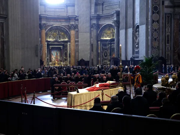 Vizionarea publică a lui Benedict s-a încheiat miercuri, înainte de un ritual religios intim în timpul căruia obiecte, inclusiv monede și medalii bătute de-a lungul mandatului său și un pergament despre pontificat, au fost așezate în sicriul său de chiparos sigilat înainte de înmormântare, potrivit CNN.