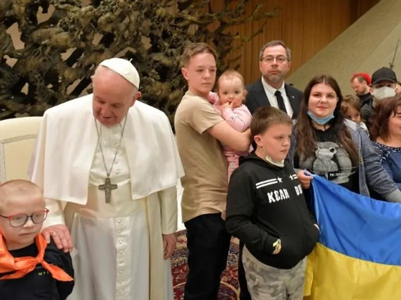 Papa Francisc şi-a reiterat miercuri apelul la încetarea „acestei monstruozităţi de război" din Ucraina şi a invitat un grup de refugiaţi ucraineni să-şi facă o poză cu el în loja din sala Paul al VI-lea, la încheierea Audienţei generale, relatează EFE.