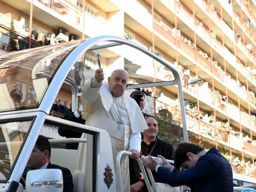 În timpul unei scurte călătorii de la aeroport cu un papamobil deschis, papa a salutat mulţimea de pe stradă şi a părut a fi în formă bună, deşi are încă o mică vânătaie pe bărbie, rezultatul a ceea ce Vaticanul a descris drept o cădere minoră, în dormitorul lui, săptămâna trecută.