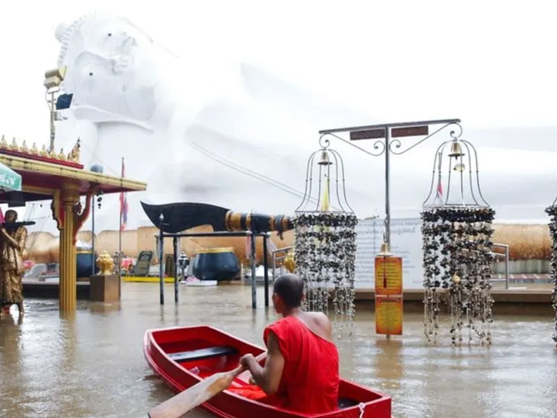 În unul dintre temple, Wat Satue, călugării au fost nevoiţi să vâslească în bărci mici din cauza apei care ajungea până la coapsă şi chiar până la nivelul gâtului.