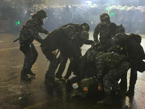 Liderul partidului Droa, Nika Gvaramia, a fost bruscat şi apoi luat de poliţişti cu cagule. El este purtat de braţe şi picioare de mai mulţi bărbaţi pe nişte trepte, potrivit imaginilor difuzate în direct de postul de televiziune independent Pirveli.