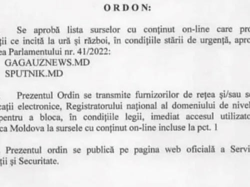 Directorul Serviciului de Informaţii şi Securitate din Republica Moldova a emis sâmbătă un ordin ce prevede blocarea a două surse cu conţinut online, promotoare de informaţii ce incită la ură şi război, în condiţiile stării de urgenţă.