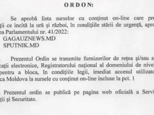 Ordinul ce conţine indicaţii cu caracter obligatoriu a fost transmis Registratorului naţional al domeniului de nivel superior „md” şi furnizorilor de reţea şi/sau servicii de comunicaţii electronice, pentru a bloca, în condiţiile legii, imediat accesul utilizatorilor din Republica Moldova la sursele menţionate, se arată pe pagina de Facebook a Serviciului de Informaţii şi Securitate al Republicii Moldova.