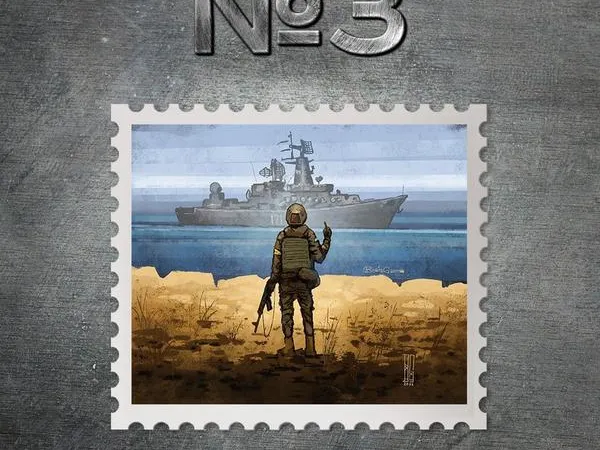 Pentru a celebra scufundarea navei amiral a flotei ruse la Marea Neagră serviciul poştal ucrainean a emis acel timbru, care a avut un mare succes la vânzare.