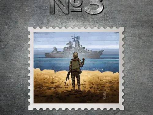 Ucrainenii au format cozi pentru a cumpăra timbrul ce arată un soldat ucrainean făcând un gest vulgar în direcţia navei ruse, alături de textul "Navă de război rusească, du-te naibii!", mesajul pe care conform unei înregistrări ucrainene neautentificate de surse independente l-ar fi comunicat acestei nave soldaţi ucraineni de pe Insula Şerpilor înainte ca ruşii să ocupe această insulă.