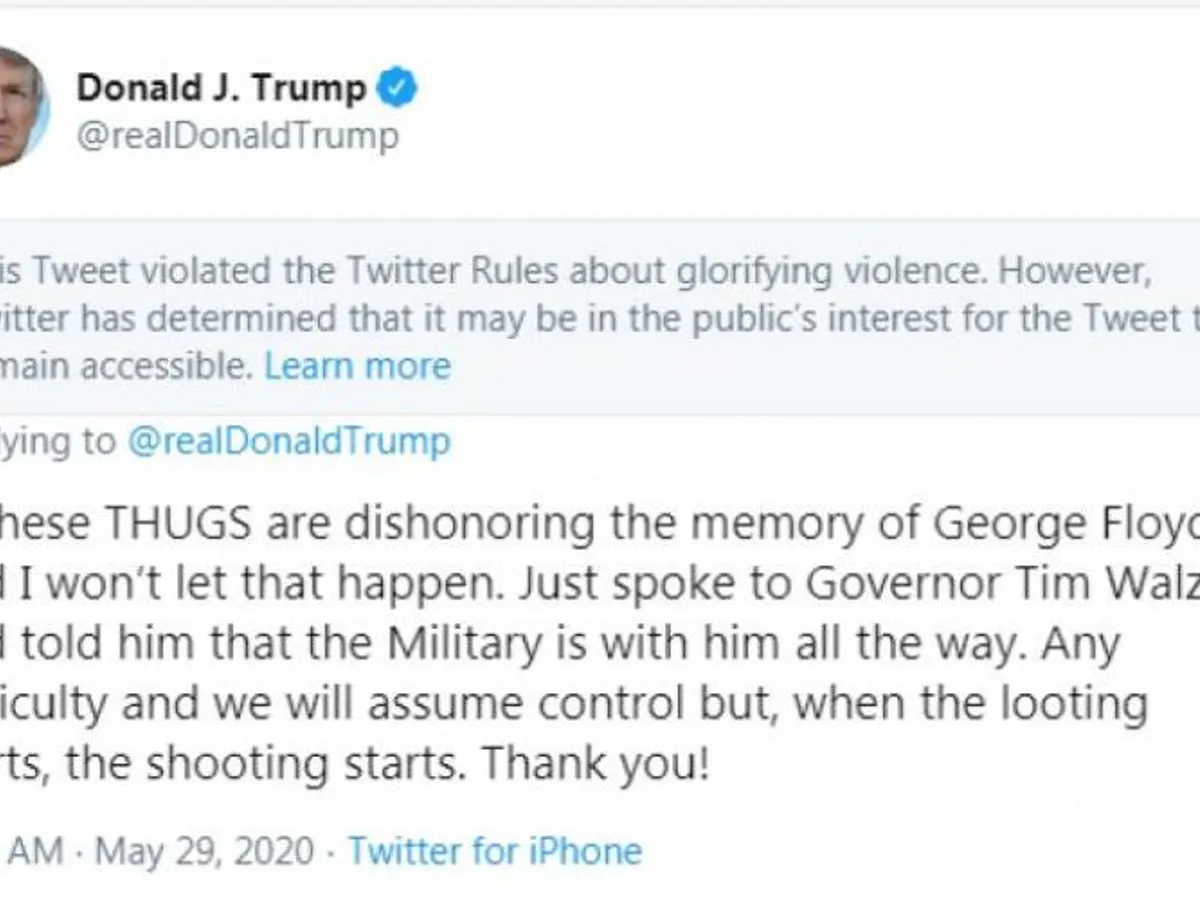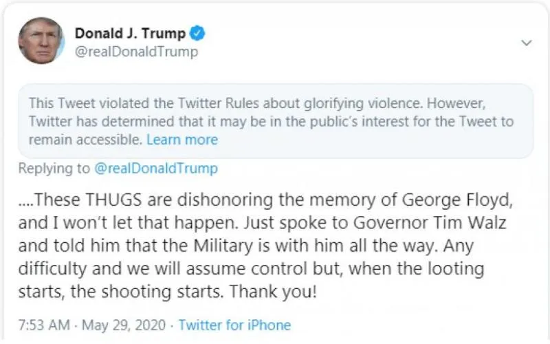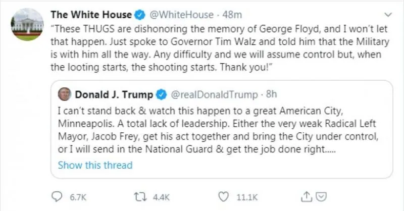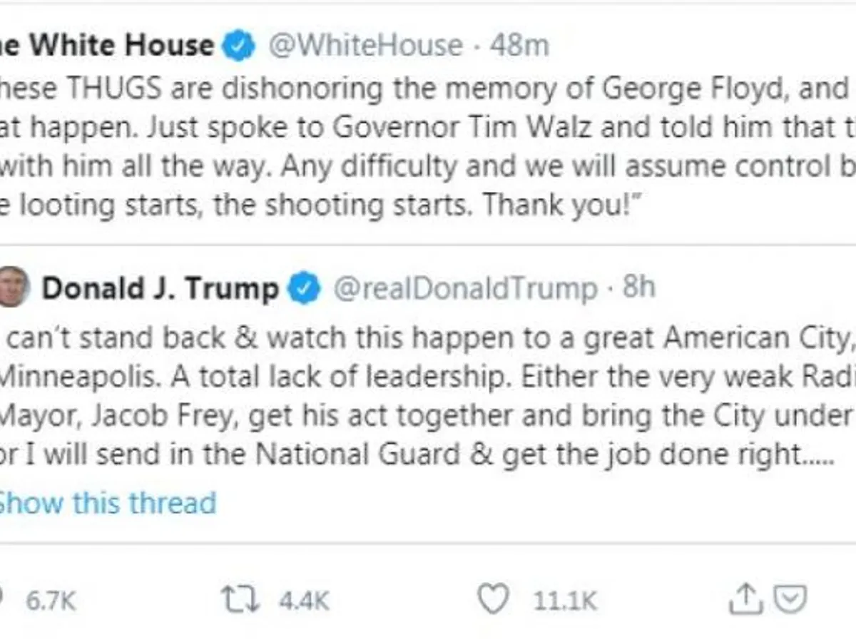 Donald Trump a folosit contul oficial de Twitter al Casei Albe pentru a republica mesajul ascuns de platformă anterior. În postarea sa, Donald Trump i-a numit pe protestatarii din Minneapolis „huligani” şi i-a ameninţat că va trimite armata să îi împuşte dacă protestele continuă.
