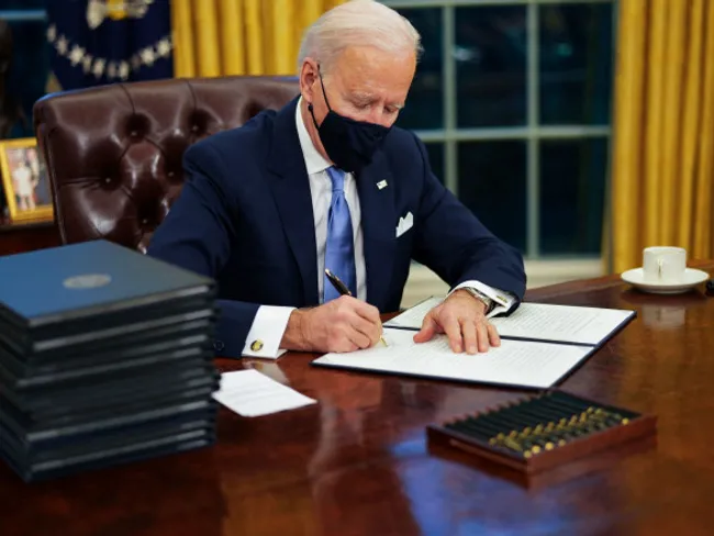 Primul său ordin executiv semnat cere americanilor ca, pe proprităţile guvernului, să poarte mască pentru prevenirea răspândirii COVID-19, potrivit NBC.