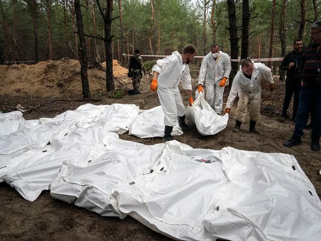 Potrivit anchetatorilor, unele corpuri exhumate aveau mâinile legate la spate. Cadavre de copii au fost de asemenea găsite în pădurea de lângă Izium.