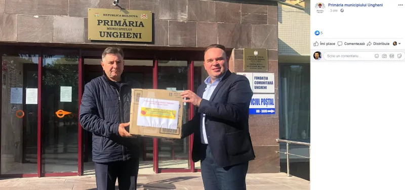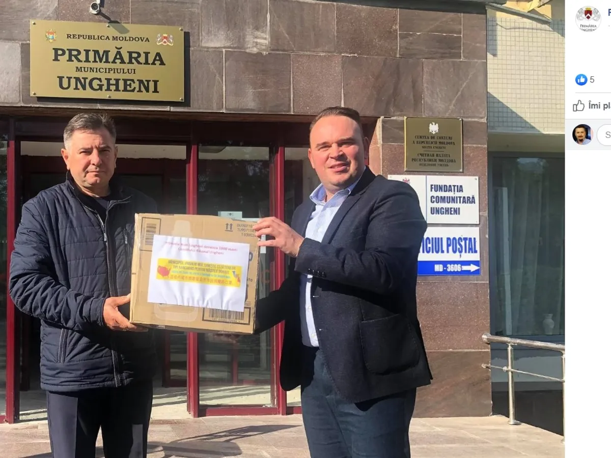 Potrivit autorităților locale din Ungheni, municipalitatea Nanchang din China a donat 40.000 de măști de protecție. Pe 19 aprilie, lotul de măști a fost preluat direct de la Aeroportul din Chișinău de către viceprimarul Dionisie Ternovschi.
