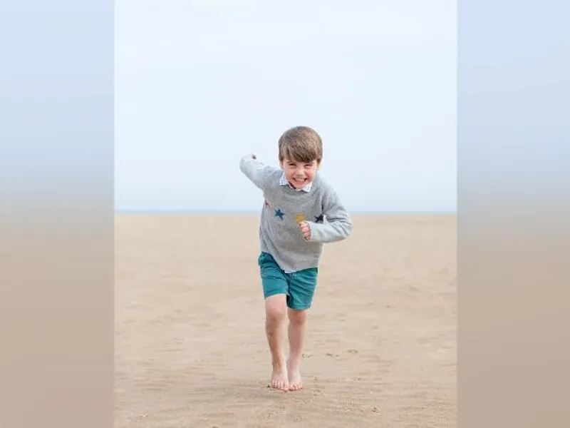 Prinţul Louis, cel mai mic dintre copiii prinţului William şi ai lui Kate Middleton, împlineşte sâmbătă 4 ani. Cu această ocazie, ducele şi ducesa de Cambridge au publicat un nou portret cu prinţul, râzând pe plajă.