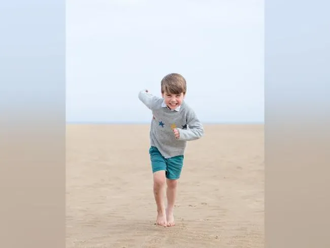În imagini, Louis pare să se joace şi aleargă pe plaja de nisip în timp ce poartă pantaloni scurţi de culoarea verde şi un pulover gri cu imprimeu de stele.