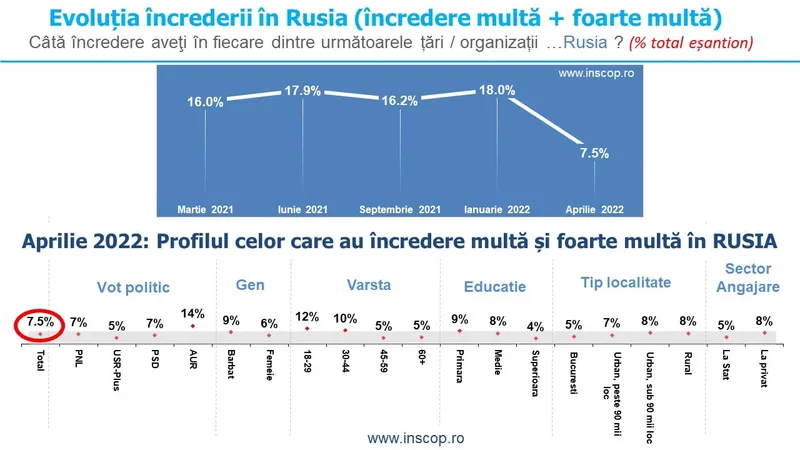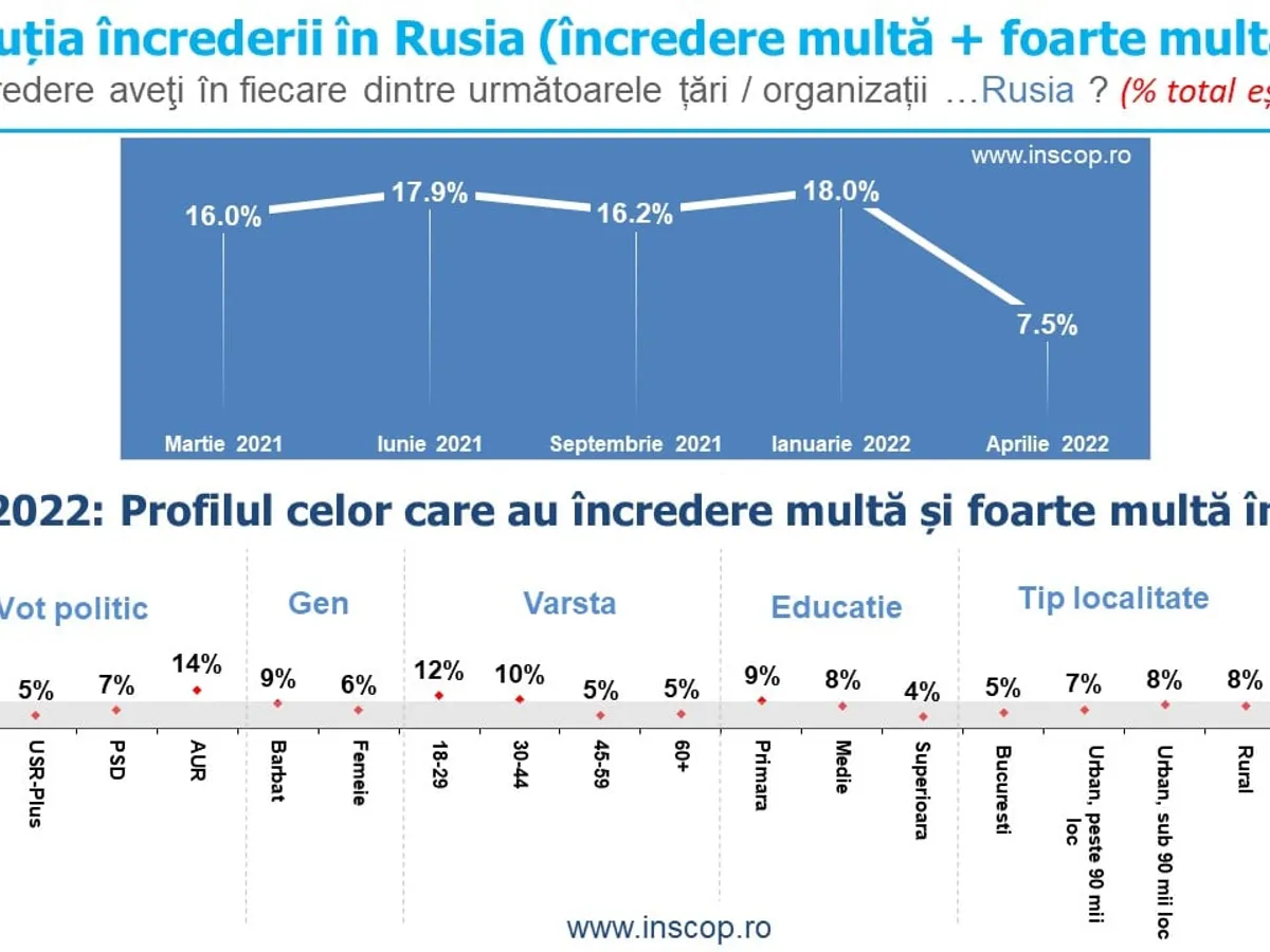 „Razboiul declansat de Rusia impotriva Ucrainei a prabusit increderea romanilor in Rusia, care oricum nu era spectaculoasa, de la 16-18% cat a fluctuat in cursul anului 2021, la doar 7.5% in aprilie 2022.