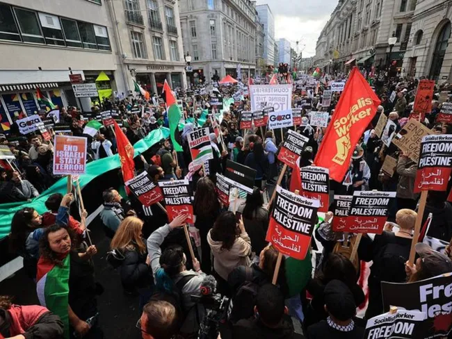 Mulţi manifestanţi ţin pancarte cu numele şi fotografiile celor dispăruţi sau ţinuţi prizonieri în urma atacului masiv lansat de Hamas sâmbăta trecută, în urma căruia au fost ucise peste 1.300 de persoane, majoritatea civili.