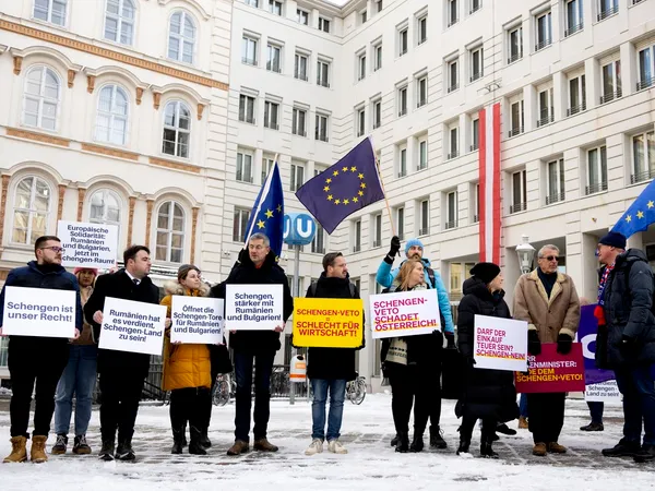 Protest la Viena, după ce România nu a fost primită în Schengen. Eurodeputați din Bulgaria și România au protestat, luni, la Viena, împotriva veto-ului Austriei, care a blocat Sofia și Bucureștiul din Schengen. La demonstrație s-au alăturat și membri ai partidului austriac NEOS.