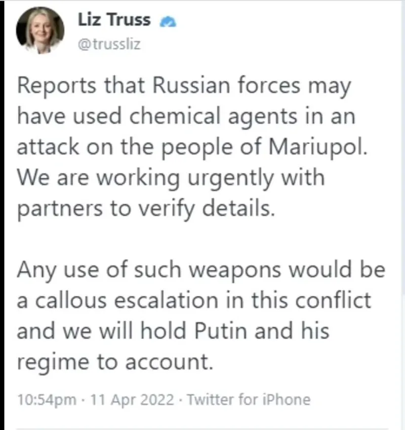 Ministrul de Externe, Liz Truss, a anunțat că există informații că rușii vor folosi arme chimice în Mariupol.