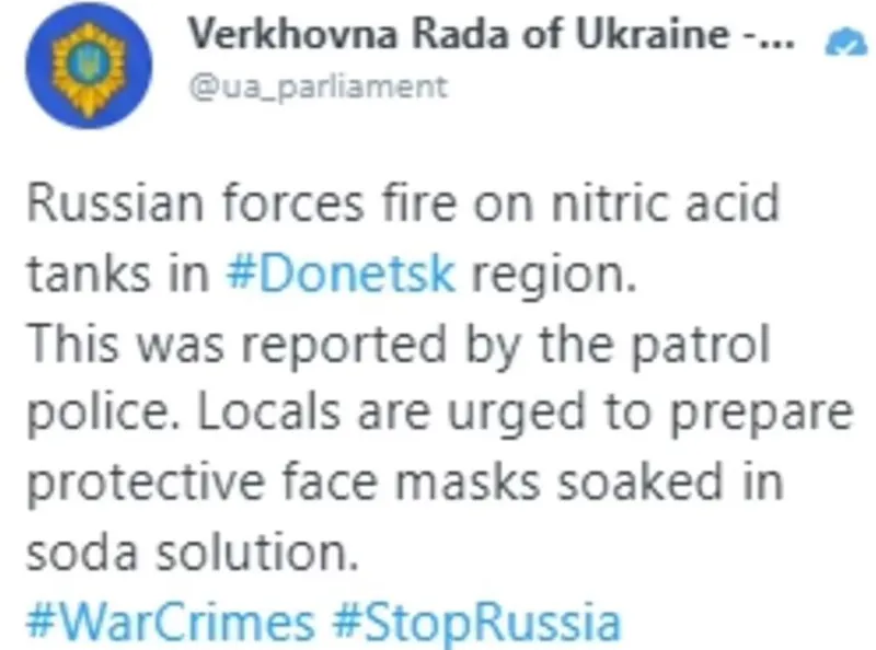 Parlamentul ucrainean a transmis pe Twitter că a primit informații că forțele ruse au folosit „acid azotic” în regiunea Donețk, dar incidentele nu sunt legate.