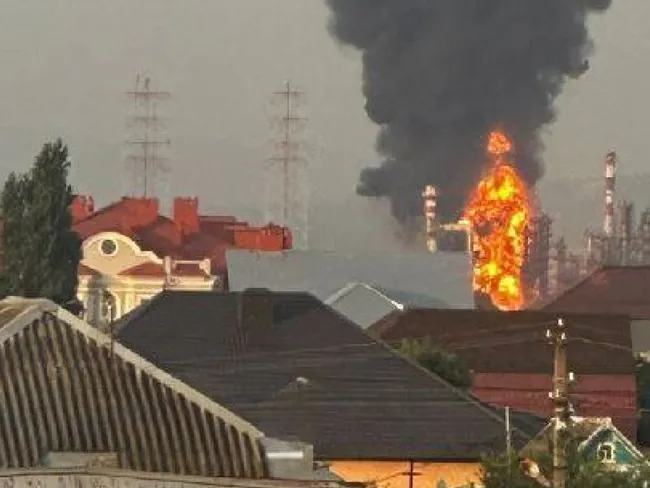 O rafinărie de petrol situată în apropierea satului Afipsky, din regiunea Krasnodar, a fost cuprinsă de flăcări în urma unui atac cu drone desfășurat în această dimineață, 7 august 2025.