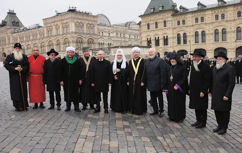 Președintele rus Vladimir Putin împreună cu lideri religioși după o ceremonie de depunere de flori cu ocazia Zilei Unității Naționale în Piața Roșie, la Moscova - Foto: Profimedia Images