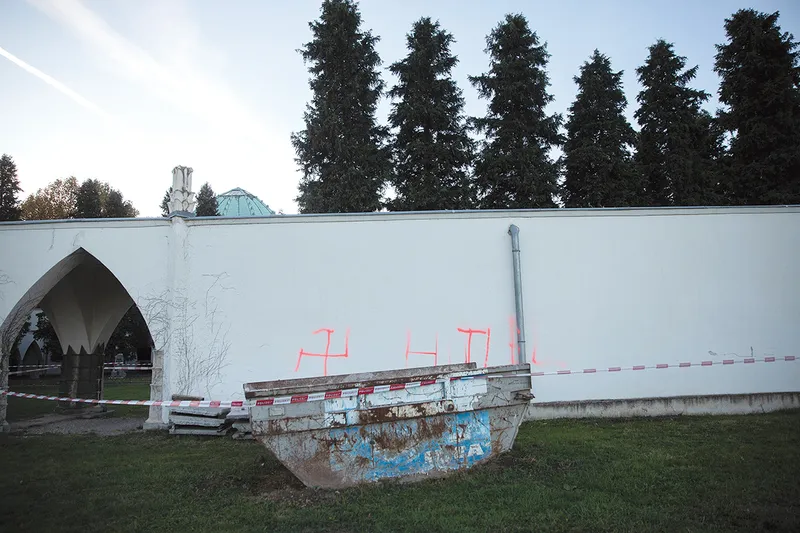 Pe zidul exterior al părții evreiești a Cimitirului Central din Viena au fost făcute cu spray o svastică și inscripția Hitler în fața sălii de ceremonii din Viena, cartierul Simmering, la 1 noiembrie 2023 - Foto: Profimedia Images