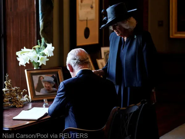 ''Dumnezeule, nu-mi place (stiloul) ăsta!'', a spus Charles ridicându-se şi înmânându-i stiloul soţiei sale, regina consoartă Camilla.