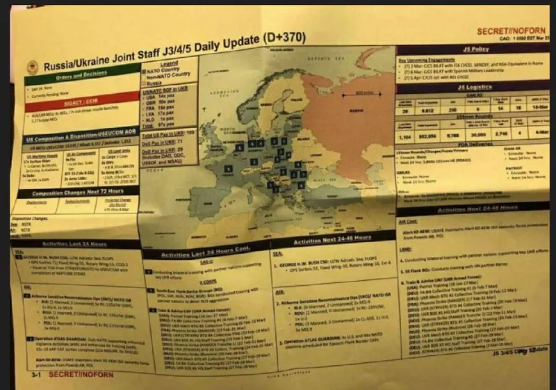 Documentul, o fotografie a unei pagini marcate cu SECRET/NOFORN, este intitulat Russia/Ukraine Joint Staff J3/4/5 Daily Update din martie.