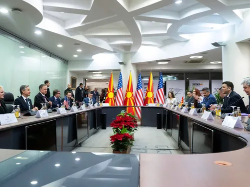 Secretarul de stat al SUA, Antony Blinken, a ajuns la Skopie, Macedonia de Nord, miercuri, 29 noiembrie 2023, și a avut o întâlnire bilaterală cu delegația Ministerului de Externe al Macedoniei de Nord.