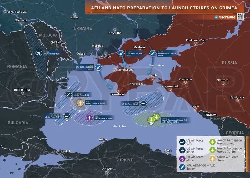 Sateliții NATO caută și detectează poziții de apărare aeriană în toată peninsula. Numărul de ședințe aproape s-a dublat, constată militarii ruși, care constată că această creștere a activității de recunoaștere aeriană a NATO, lansările de rachete momeală în Crimeea și intensitate mare de filmare pe suprafața Crimeei vor avea ca urmare un atac masiv în peninsulă.