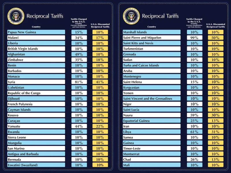Trump și Casa Albă au distribuit pe rețelele de socializare o serie de grafice care detaliază ratele tarifare pe care spun că alte țări le impun Statelor Unite. Aceste rate presupuse includ „Manipularea valutară și barierele comerciale” ale țărilor.