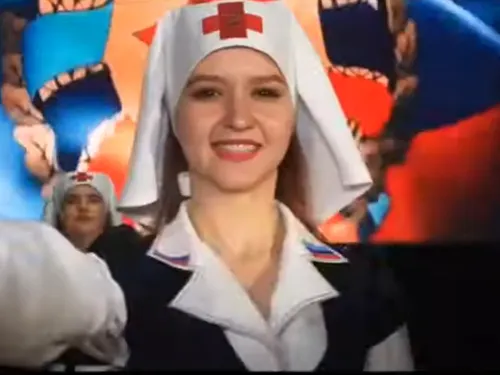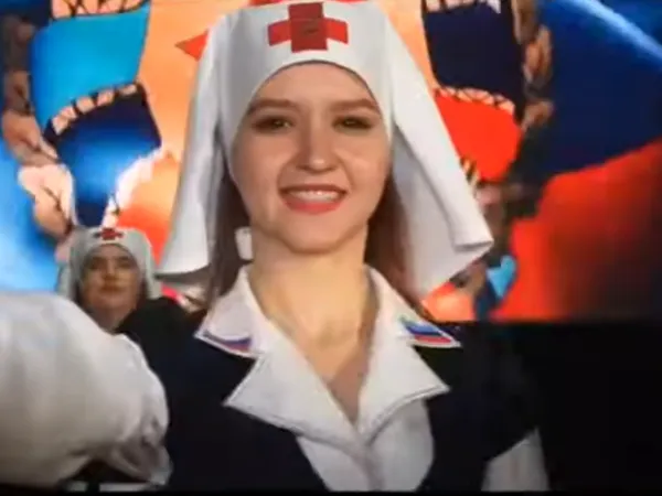 Tinerele femei aparent îmbrăcate în uniforme de infirmieră în stilul Primului Război Mondial formează literele "Z" și "V" - care nu fac parte din alfabetul chirilic, dar care apar pe vehiculele rusești invadatoare - și cântă despre importanța patriotismului, relatează The Times.
