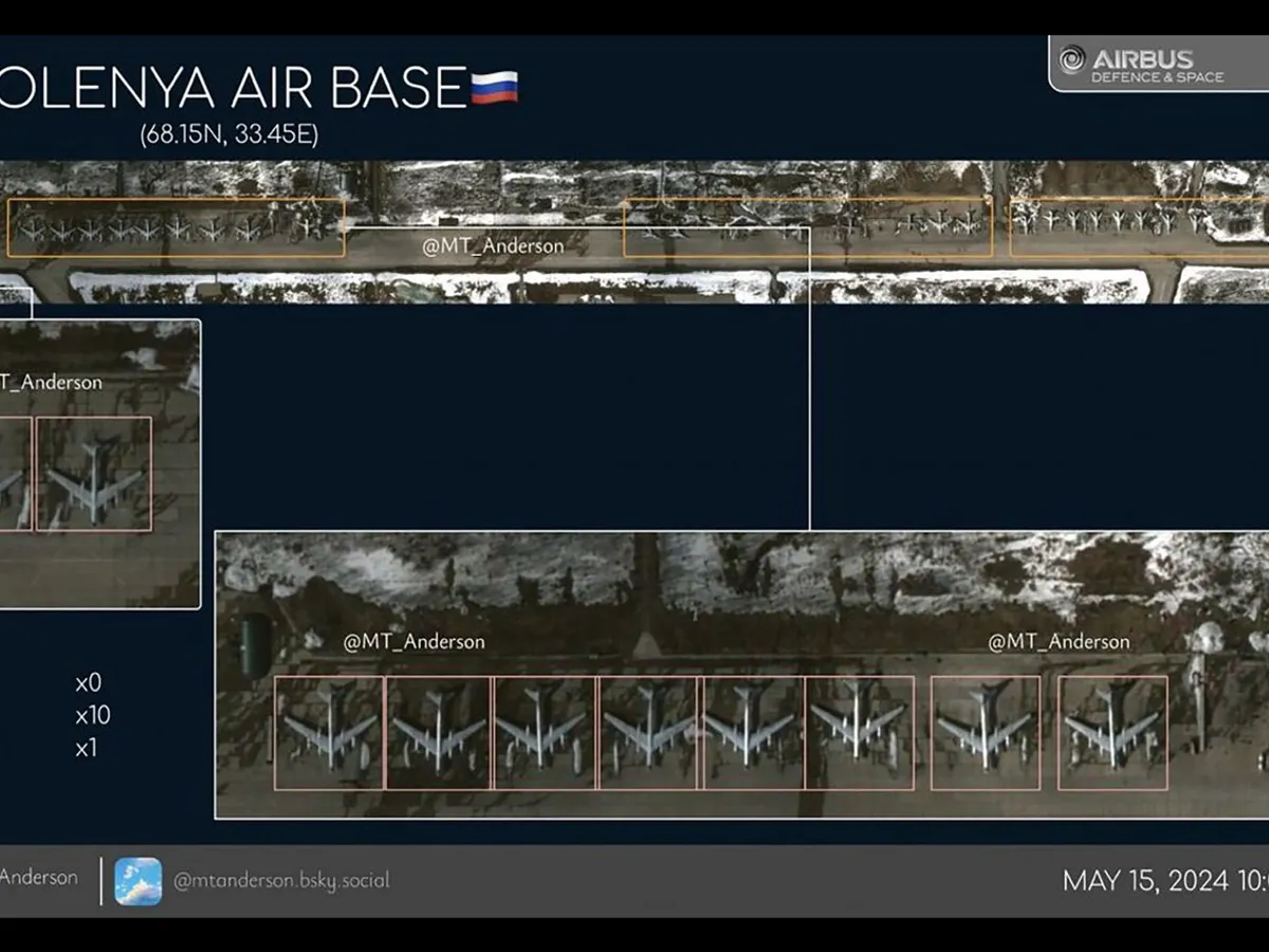 Imaginile din satelit publicate pe X / Twitter de analistul OSINT MT Anderson au dezvăluit că 12 bombardiere strategice Tu-95MS și 13 Tu-22M3, împreună cu un Tu-160 și două avioane de transport militar An-12 se aflau pe aerodromul Olenya la 15 mai.