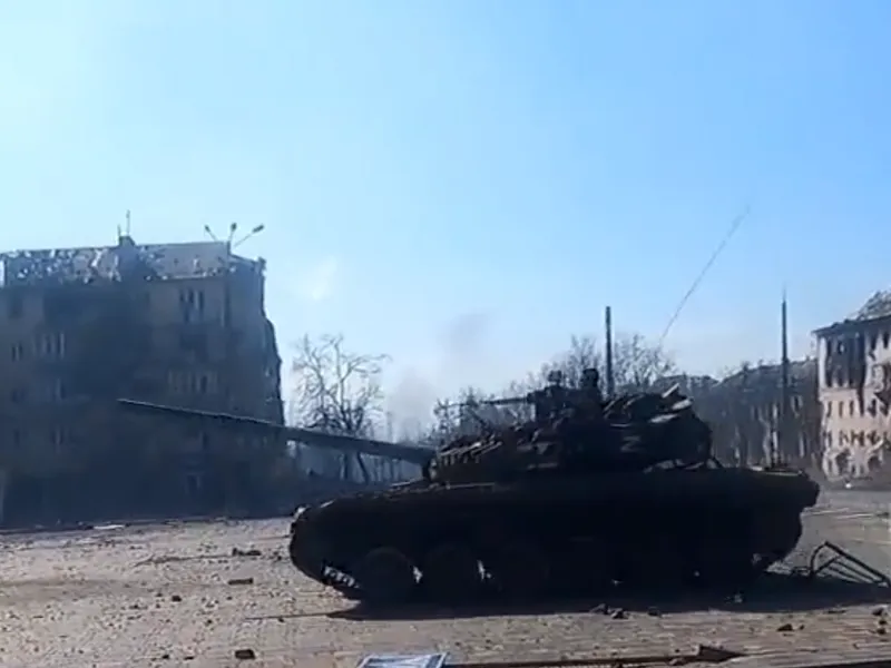 Drifturi cu tancul în centrul orașului Mariupol. Rușii au fost filmați în timp ce făceau drifturi cu un vehicul blindat în orașul distrus de bombardamente. Ramzan Kadîrov a promis că trupele ruse vor obține joi, „înainte sau după prânz”, controlul asupra combinatului.