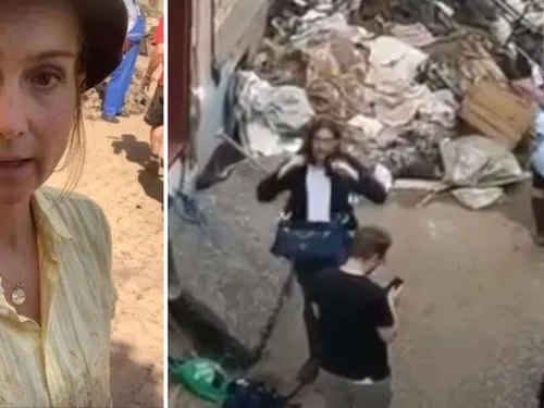 În înregistrare se aude o persoană care râde în timp ce reporteriţa, plină de noroi, se întoarce către cameraman pentru a transmite reportajul.