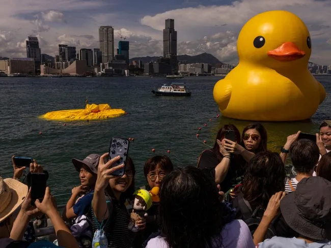 Mulțimi de locuitori și turiști s-au adunat pe o căldură toridă, pe promenada din apropierea sediului Guvernului, din Admiralty, pentru a face fotografii cu rațele realizate de olandez.