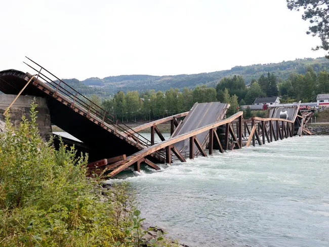 Un pod rutier din lemn s-a prăbuşit luni dimineaţă în sudul Norvegiei, iar două vehicule care circulau pe pod - un vehicul de marfă şi un autoturism - au căzut în apă, potrivit martorilor, a anunţat poliţia norvegiană.